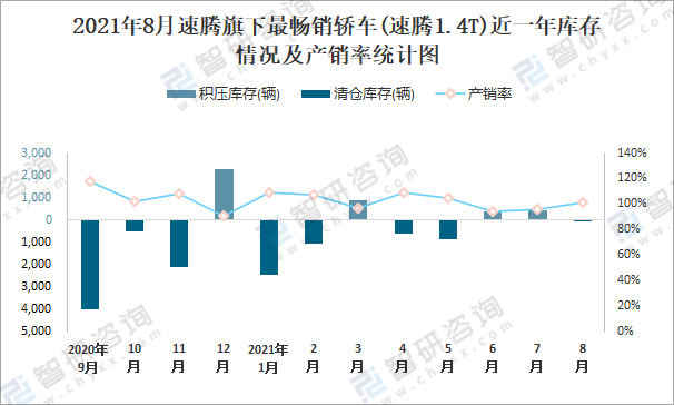 2021年8月速騰旗下最暢銷車(速騰1.4T)近一年庫存情況及產銷率統(tǒng)計圖