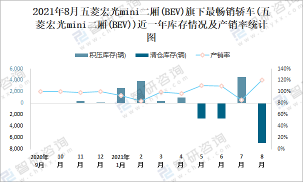 2021年8月五菱宏光MINI二廂(BEV)旗下最暢銷(xiāo)車(chē)(五菱宏光mini二廂(BEV))近一年庫(kù)存情況及產(chǎn)銷(xiāo)率統(tǒng)計(jì)圖