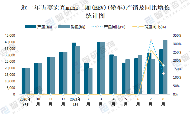 根據(jù)中國(guó)汽車(chē)工業(yè)協(xié)會(huì)數(shù)據(jù)可知:2021年8月五菱宏光mini二廂(BEV)(轎車(chē))產(chǎn)量為34258輛,同比增長(zhǎng)124.5%,銷(xiāo)量為41188輛,同比增長(zhǎng)174.6%,當(dāng)月產(chǎn)銷(xiāo)率為120.23%;2021年1-8月五菱宏光mini二廂(BEV)(轎車(chē))累計(jì)產(chǎn)量為250942輛,同比下降0%,累計(jì)銷(xiāo)量為250860輛,同比下降0%,累計(jì)產(chǎn)銷(xiāo)率為99.97%;且2020年五菱宏光mini二廂(BEV)(轎車(chē))總產(chǎn)量大于總銷(xiāo)量,積壓了庫(kù)存609輛。