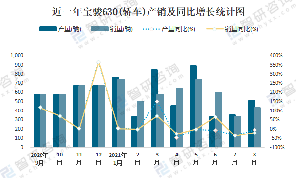 根據中國汽車工業協會數據可知:2021年8月寶駿630(轎車)產量為510輛,同比下降3.4%,銷量為432輛,同比下降18.2%,當月產銷率為84.71%;2021年1-8月寶駿630(轎車)累計產量為4482輛,同比增長29.7%,累計銷量為4584輛,同比增長32.6%,累計產銷率為102.28%;2014-2020年寶駿630(轎車)產銷量均在2014年達到最高值,此后總體呈現下降趨勢,且近7年總銷量大于總產量,清倉庫存3258輛。