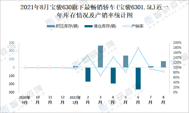 根據中國汽車工業協會數據統計可知:2021年8月寶駿630(轎車)旗下只有1款寶駿6301.5L轎車在銷售;近一年寶駿6301.5L共清倉庫存102輛,其產銷率存在一定幅度波動,2021年6月產銷率最高(178.57%),清倉庫存264輛,2021年3月產銷率偏低(68.57%),積壓庫存264輛。