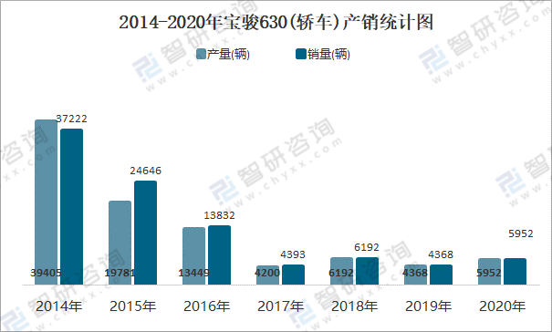 2014-2020年寶駿630(轎車)產銷統計圖