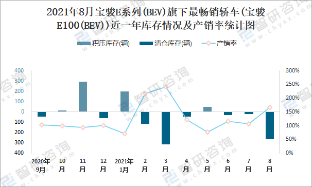 2021年8月寶駿E系列(BEV)旗下最暢銷車(寶駿E100(BEV))近一年庫存情況及產銷率統計圖