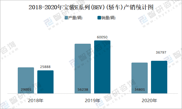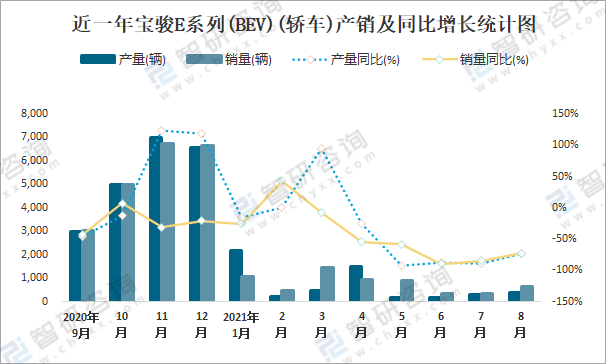 根據中國汽車工業協會數據可知:2021年8月寶駿E系列(BEV)(轎車)產量為400輛,同比下降73%,銷量為664輛,同比下降72.4%,當月產銷率為166%;2021年1-8月寶駿E系列(BEV)(轎車)累計產量為5472輛,同比下降58.7%,累計銷量為6178輛,同比下降59.9%,累計產銷率為112.9%;2018-2020年寶駿E系列(BEV)(轎車)產銷量均在2019年達到最高值,此后大幅度下滑,且近3年總銷量大于總產量,清倉庫存2695輛。