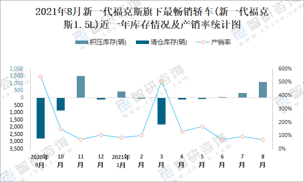 2021年8月新一代福克斯旗下最暢銷車(新一代福克斯1.5L)近一年庫存情況及產銷率統計圖