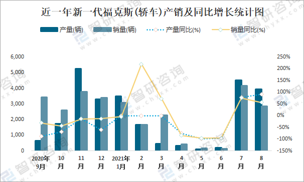 根據中國汽車工業協會數據可知:2021年8月新一代福克斯(轎車)產量為3924輛,同比增長92.1%,銷量為2838輛,同比增長56.5%,當月產銷率為72.32%;2021年1-8月新一代福克斯(轎車)累計產量為14649輛,同比下降8.2%,累計銷量為14756輛,同比下降24%,累計產銷率為100.73%;2018-2020年新一代福克斯(轎車)產銷量均在2019年達到最高值,此后有所下降,且近3年總產量大于總銷量,積壓了庫存1492輛。