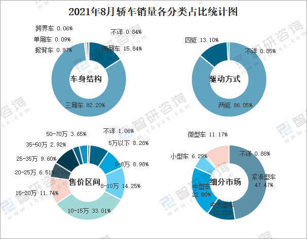 根據中國汽車工業協會數據統計可知:2021年8月轎車總計產量為723076輛,總計銷量為741567輛;車身結構為三廂車型的占比最大,驅動方式為兩驅的轎車銷量最多,售價在10-15萬之間的轎車銷售情況最好,以及緊湊型車最受青睞。