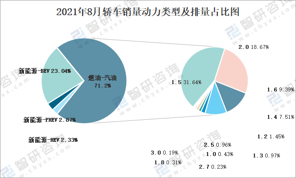 2021年8月轎車銷量動力類型及排量占比圖