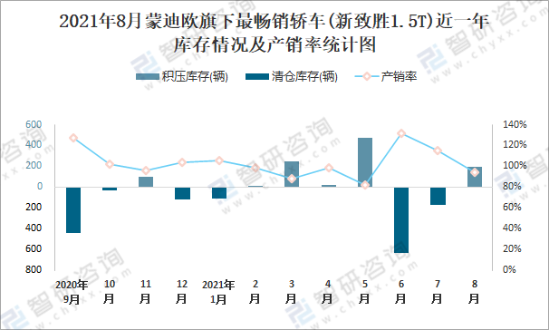 2021年8月蒙迪歐旗下最暢銷車(新致勝1.5T)近一年庫存情況及產銷率統計圖