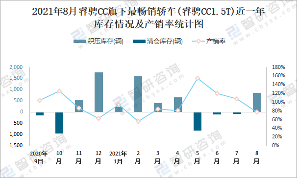 2021年8月睿騁CC旗下最暢銷車(睿騁CC1.5T)近一年庫存情況及產(chǎn)銷率統(tǒng)計圖
