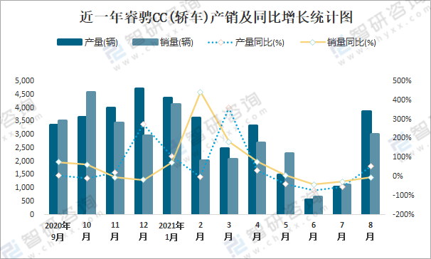 近一年睿騁CC(轎車)產(chǎn)銷及同比增長統(tǒng)計圖