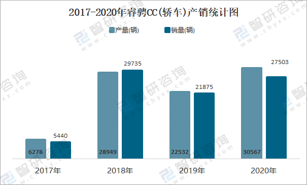 2017-2020年睿騁CC(轎車)產(chǎn)銷統(tǒng)計圖