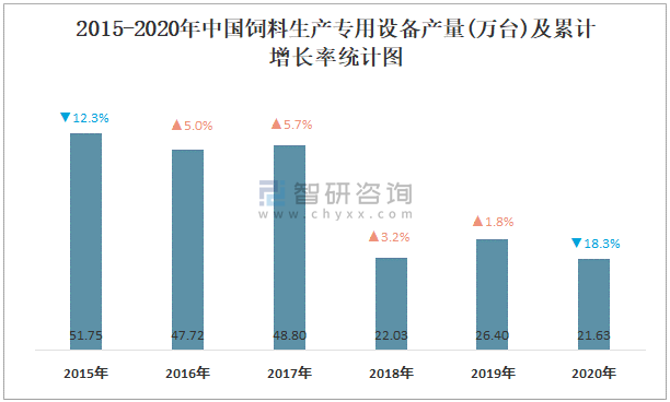 2015-2020年中國(guó)飼料生產(chǎn)專用設(shè)備產(chǎn)量及累計(jì)增長(zhǎng)率統(tǒng)計(jì)圖