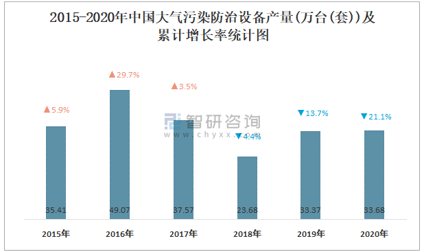 2015-2020年中國大氣污染防治設備產量及累計增長率統計圖