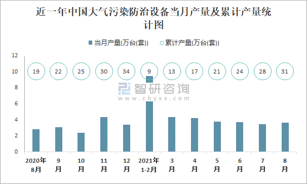 近一年中國大氣污染防治設備當月產量及累計產量統計圖