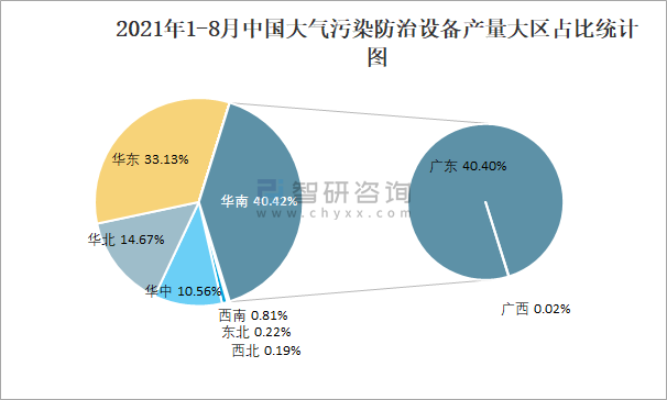 2021年1-8月中國大氣污染防治設備產量大區占比統計圖