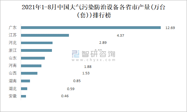 2021年1-8月中國大氣污染防治設備各省市產量排行榜