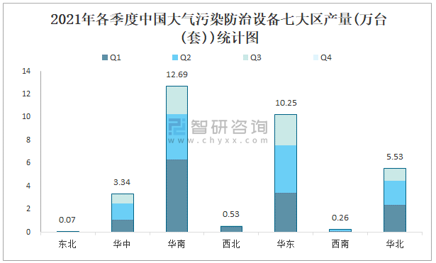 2021年各季度中國大氣污染防治設備七大區產量統計圖