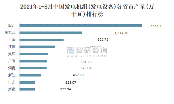2021年1-8月中國發(fā)電機組(發(fā)電設(shè)備)各省市產(chǎn)量排行榜