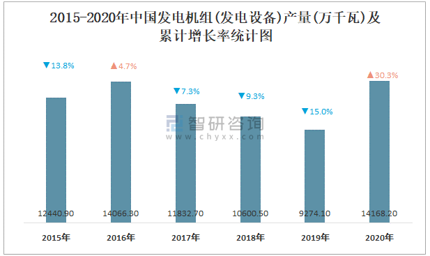 2015-2020年中國發(fā)電機組(發(fā)電設(shè)備)產(chǎn)量及累計增長率統(tǒng)計圖