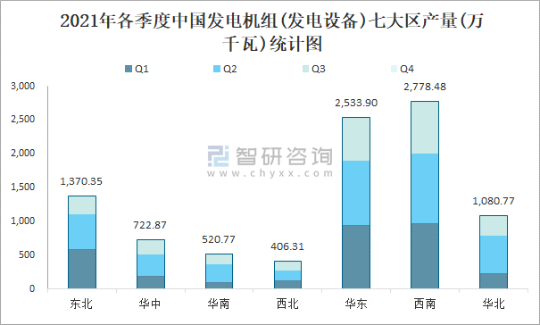 2021年各季度中國發(fā)電機組(發(fā)電設(shè)備)七大區(qū)產(chǎn)量統(tǒng)計圖