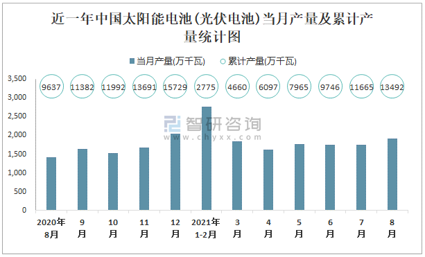 2021年1-8月中國太陽能電池(光伏電池)產量為5913.5萬千瓦 累計增長6.7%
