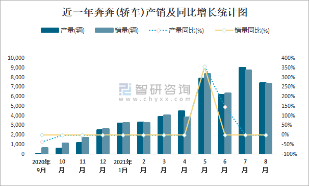 根據中國汽車工業協會數據可知:2021年8月奔奔(轎車)產量為7400輛,同比下降0%,銷量為7358輛,同比下降0%,當月產銷率為99.43%;2021年1-8月奔奔(轎車)累計產量為45364輛,同比下降0%,累計銷量為45235輛,同比下降0%,累計產銷率為99.72%;2014-2020年奔奔(轎車)產銷量均在2019年跌至最低值,此后有所回升,且近7年總銷量大于總產量,清倉庫存2264輛。