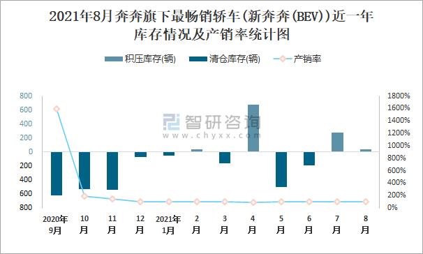 2021年8月奔奔旗下最暢銷車(新奔奔(BEV))近一年庫存情況及產銷率統計圖
