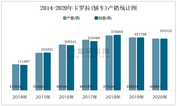 2014-2020年卡羅拉(轎車)產銷統計圖