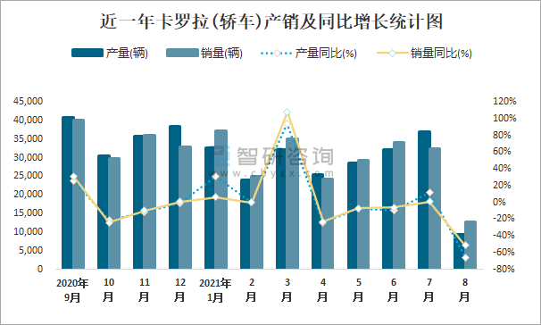 近一年卡羅拉(轎車)產銷及同比增長統計圖