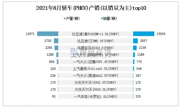 2021年8月轎車(PHEV)產銷(以銷量為主)top10