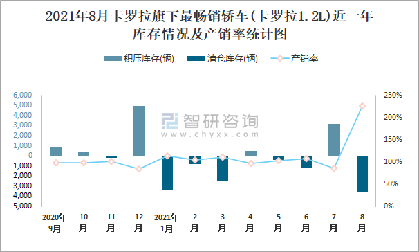2021年8月卡羅拉旗下最暢銷車(卡羅拉1.2L)近一年庫存情況及產銷率統計圖