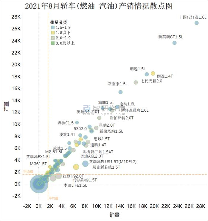 從下圖散點圖可看出,以產銷平均值作為四象限分界線,大部分燃油轎車集中在第一象限及第三象限,即產多銷多,產少銷少,特別是第三象限的部分轎車產銷率較高(散點大小代表了產銷率),庫存清理工作是這批小眾轎車的主要目標,銷量排名前十的燃油轎車中,1.5-1.9排量的轎車最多,2021年8月十四代軒逸1.6L躍居銷量冠軍,與新英朗GT1.5L的產銷量遠超于其他轎車銷量。