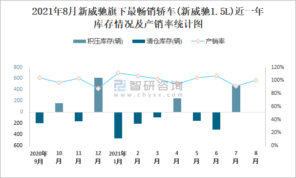 2021年8月新威馳旗下最暢銷車(新威馳1.5L)近一年庫存情況及產銷率統計圖