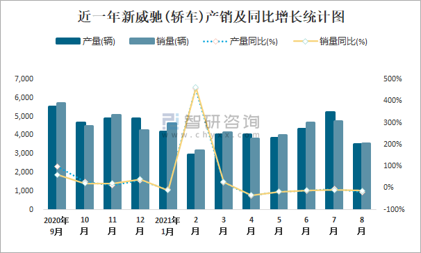 根據中國汽車工業協會數據可知:2021年8月新威馳(轎車)產量為3531輛,同比下降20.8%,銷量為3532輛,同比下降12.8%,當月產銷率為100.03%;2021年1-8月新威馳(轎車)累計產量為32167輛,同比下降4.6%,累計銷量為32688輛,同比下降4%,累計產銷率為101.62%;2014-2020年新威馳(轎車)產銷量均在2014年達到最高值,此后總體呈現下降趨勢,且近7年總銷量大于總產量,清倉庫存837輛。
