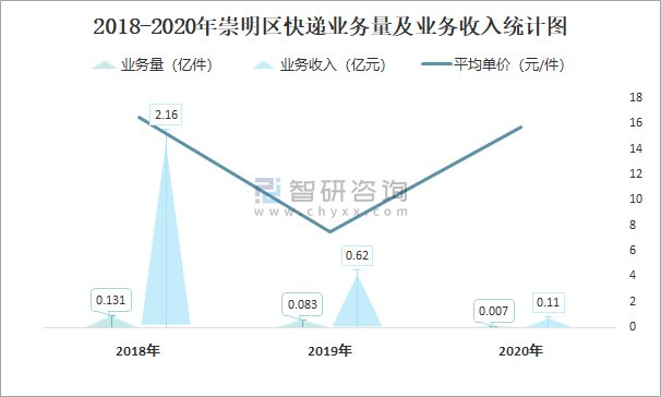 2018-2020年崇明區快遞業務量及業務收入統計圖
