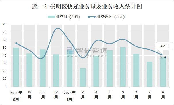 2021年8月崇明區快遞業務量與業務收入分別為38.4萬件和451.90萬元