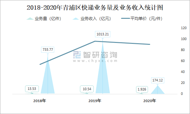 2018-2020年青浦區快遞業務量及業務收入統計圖