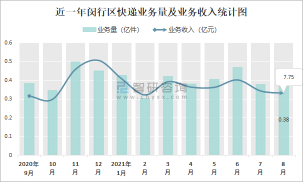 根據各省市郵政局數據可知:2021年8月閔行區快遞業務量占上海快遞業務量的12.15%,上海快遞業務量占全國快遞業務量的3.48%;2021年8月閔行區快遞業務收入占上海快遞業務收入的5.76%,上海快遞業務收入占全國快遞業務收入的16.01%。