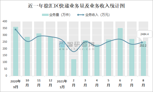 近一年徐匯區(qū)快遞業(yè)務(wù)量及業(yè)務(wù)收入統(tǒng)計(jì)圖