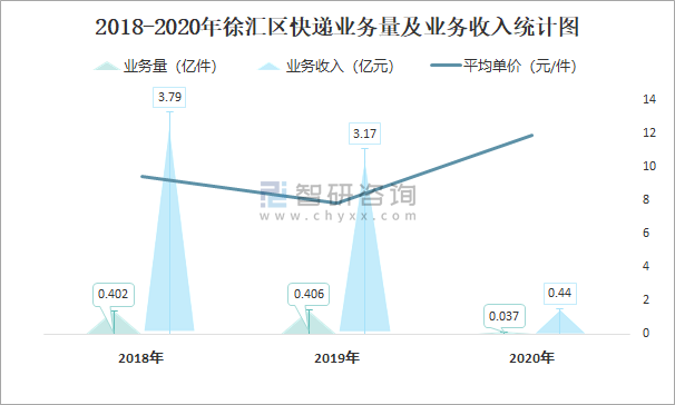 2018-2020年徐匯區(qū)快遞業(yè)務(wù)量及業(yè)務(wù)收入統(tǒng)計(jì)圖