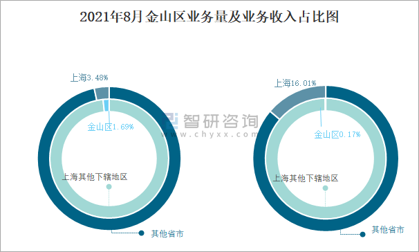 根據各省市郵政局數據可知:2021年8月金山區快遞業務量占上海快遞業務量的1.69%,上海快遞業務量占全國快遞業務量的3.48%;2021年8月金山區快遞業務收入占上海快遞業務收入的0.17%,上海快遞業務收入占全國快遞業務收入的16.01%。