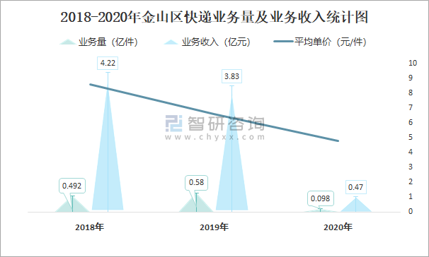2018-2020年金山區快遞業務量及業務收入統計圖