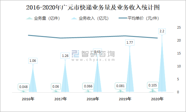2016-2020年廣元市快遞業務量及業務收入統計圖