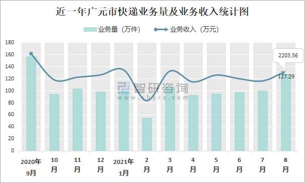 根據各省市郵政局數據可知:2021年8月廣元市快遞業務量為127.29萬件,業務收入為2203.56萬元;2021年1-8月廣元市快遞累計業務量為770.34萬件,同比增長28.09%,累計業務收入為16030.44萬元,同比增長21.84%;2016-2020年廣元市快遞業務量與業務收入均逐年遞增,平均單價總體呈現下降趨勢。
