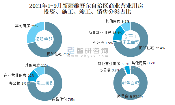 根據(jù)國(guó)家統(tǒng)計(jì)局?jǐn)?shù)據(jù)統(tǒng)計(jì)可知:2021年1-9月新疆維吾爾自治區(qū)房地產(chǎn)開(kāi)發(fā)企業(yè)在包括商業(yè)營(yíng)業(yè)用房在內(nèi)的其他用房投資金額占比為28.9%(注:只有投資金額中其他用房包含辦公樓、商業(yè)營(yíng)業(yè)用房),商業(yè)營(yíng)業(yè)用房的新開(kāi)工面積與竣工面積所占比重差異不大,從銷(xiāo)售面積來(lái)看,商業(yè)營(yíng)業(yè)用房銷(xiāo)售面積占比高于辦公樓銷(xiāo)售面積占比。