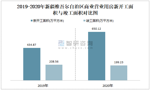 2019-2020年新疆維吾爾自治區(qū)商業(yè)營(yíng)業(yè)用房新開(kāi)工面積與竣工面積對(duì)比圖