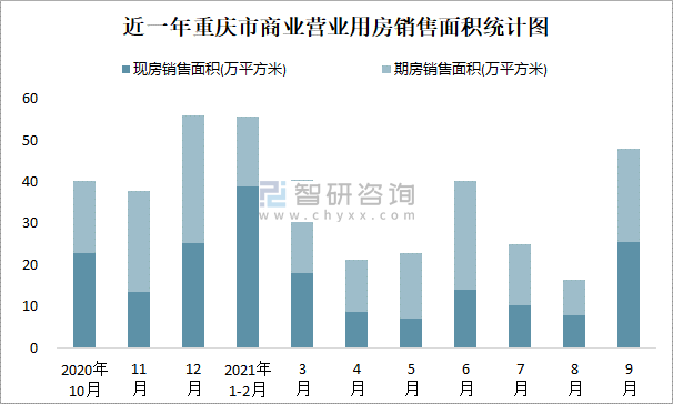 根據國家統計局數據可知:2021年9月重慶市商業營業用房銷售面積為47.99萬平方米(其中銷售現房25.56萬平方米,期房22.43萬平方米);2021年1-9月重慶市商業營業用房累計銷售面積為269.89萬平方米;近一年重慶市商業營業用房期房銷售面積遠高于現房銷售面積。