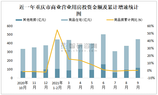 根據國家統計局數據統計可知:2021年9月重慶市房地產開發投資商品房投資金額為447.17億元,其中包括辦公樓、商業營業用房等其他用房117.28億元(注:辦公樓、商業營業用房未分開統計);2021年1-9月重慶市房地產開發投資包括商業營業用房在內的其他用房累計金額為824.98億元。