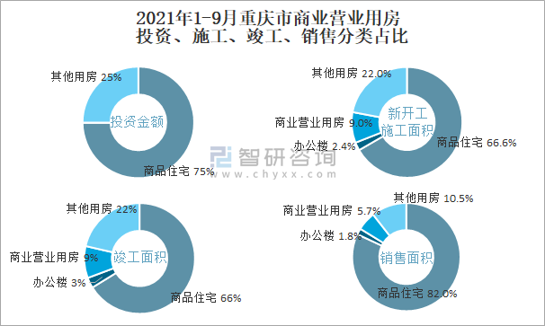 根據國家統計局數據統計可知:2021年1-9月重慶市房地產開發企業在包括商業營業用房在內的其他用房投資金額占比為25.1%(注:只有投資金額中其他用房包含辦公樓、商業營業用房),商業營業用房的新開工面積與竣工面積所占比重差異不大,從銷售面積來看,商業營業用房銷售面積占比高于辦公樓銷售面積占比。
